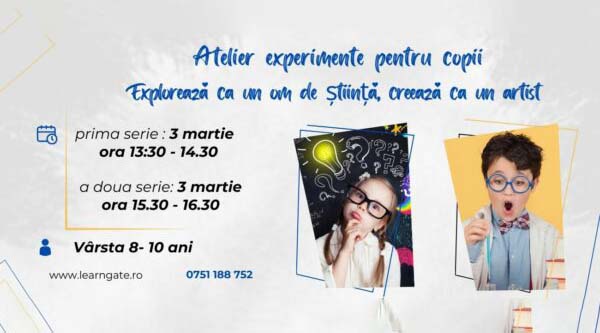Înscrieți-l la atelierul „Explorează ca un om de știință, creează ca un artist”, unde prin activități practice și distractive copiii vor învăța: